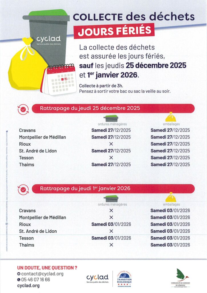 La collecte des déchets est assurée les jours fériés sauf les jeudis 25 décembre 2025 et 1er janvier 2026.
