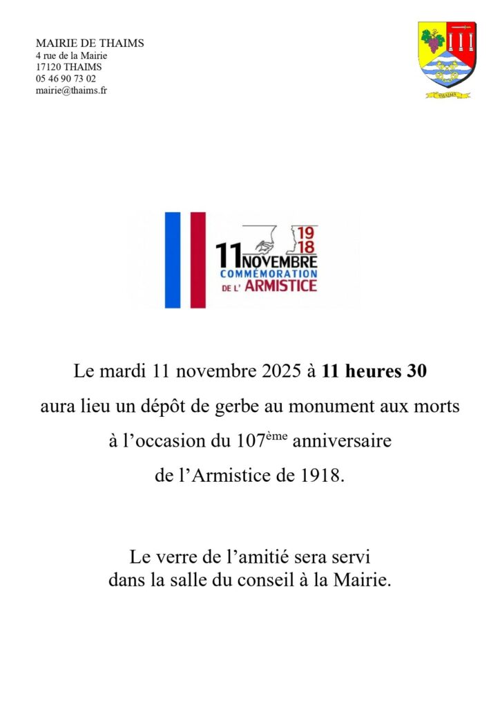 Le mardi 11 novembre 2025 à 11heures 30 aura lieu un dépôt de gerbe au monument aux morts à l’occasion du 107ème anniversaire de l’Armistice de 1918.