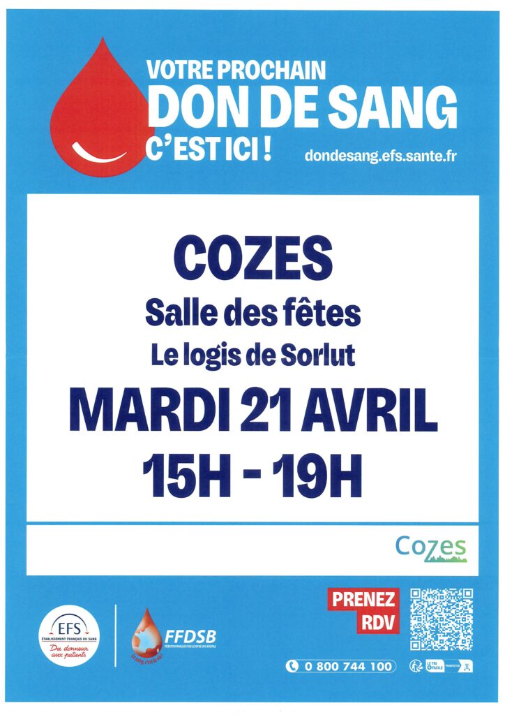 Don du sangPar Magali DANTHU / 7 avril 2026 Don du sang à la salle des fêtes Le logis du Sorlut le mardi 21 avril de 15h à 19h Facebook Twitter LinkedIn Email Imprimer