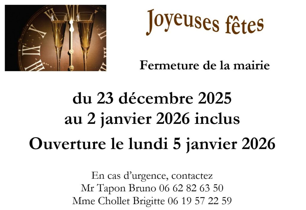 Fermeture de la mairie – Fêtes de fin d’annéePar Magali DANTHU / 22 décembre 2025 Fermeture de la mairie du 23 décembre 2025 au 2 janvier 2026. Ouverture le lundi 5 janvier 2026 Facebook Twitter LinkedIn Email Imprimer