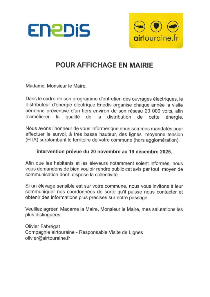 Dans le cadre de son programme d’entretien des ouvrages électriques, le distributeur d’énergie électrique Enédis organise chaque année la visite aérienne préventive d’un tiers environ de son réseau 20 000 volts, afin d’améliorer la qualité de la distribution de cette énergie.