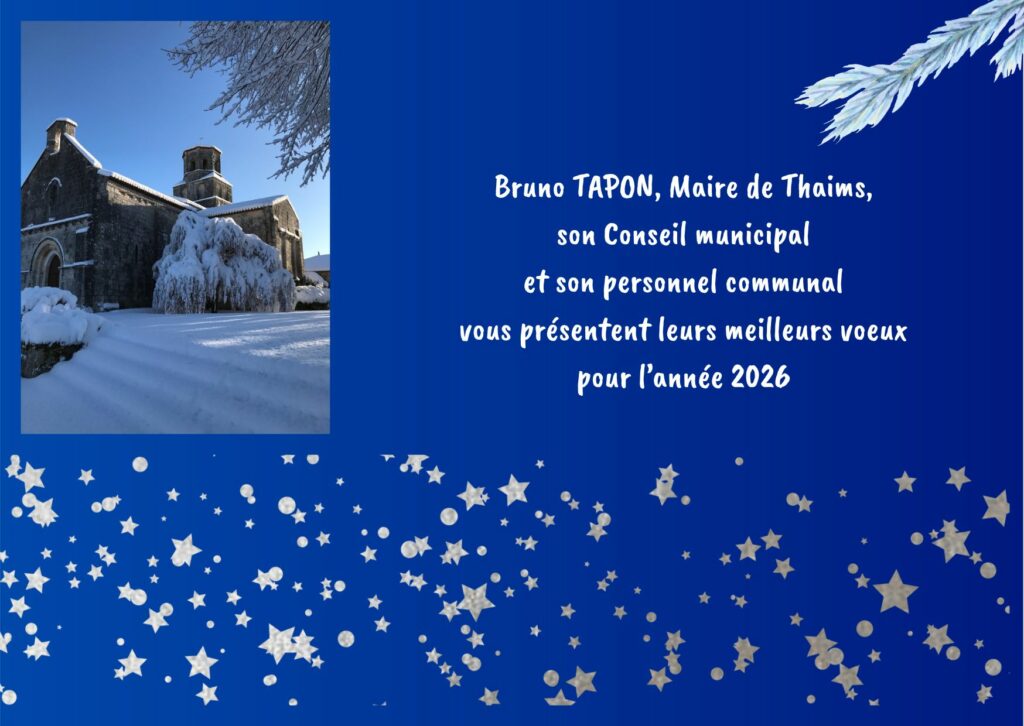 Bruno TAPON, Maire de Thaims, son Conseil municipal et son personnel communal vous présentent leurs meilleurs voeux pour l’année 2026.